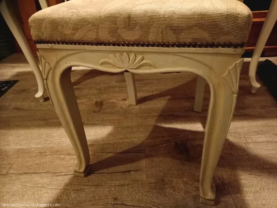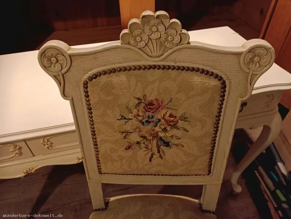 Angeboten wird ein antiker Echtholzstuhl mit Schnitzerei in Altweiß, komplett mit aufwendig gearbeiteter Gobelinarbeit in floralem Muster bezogen.