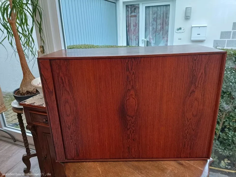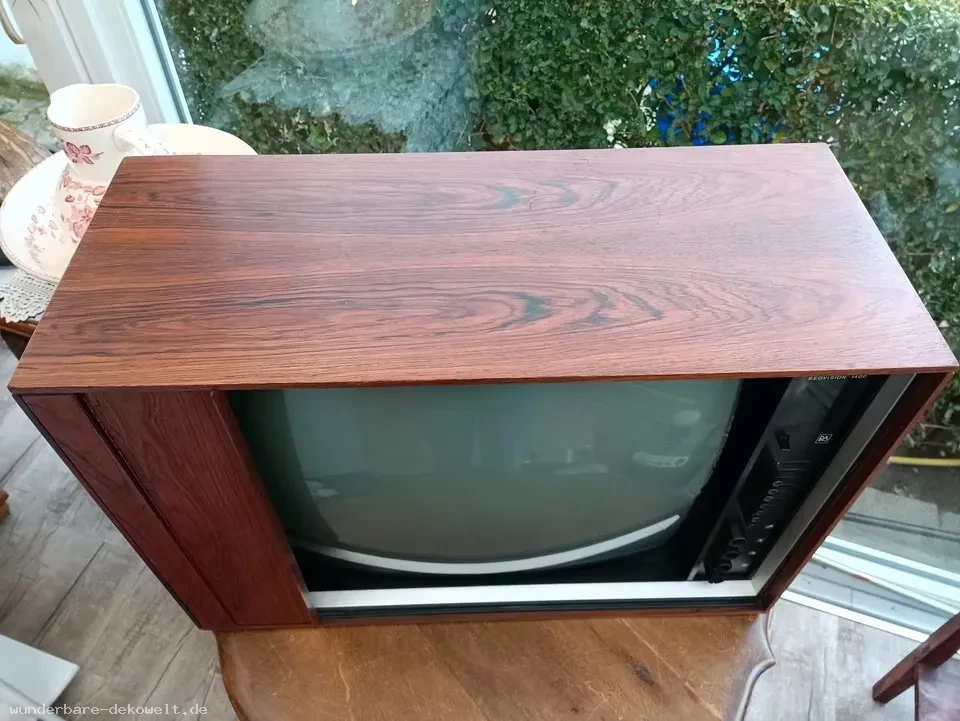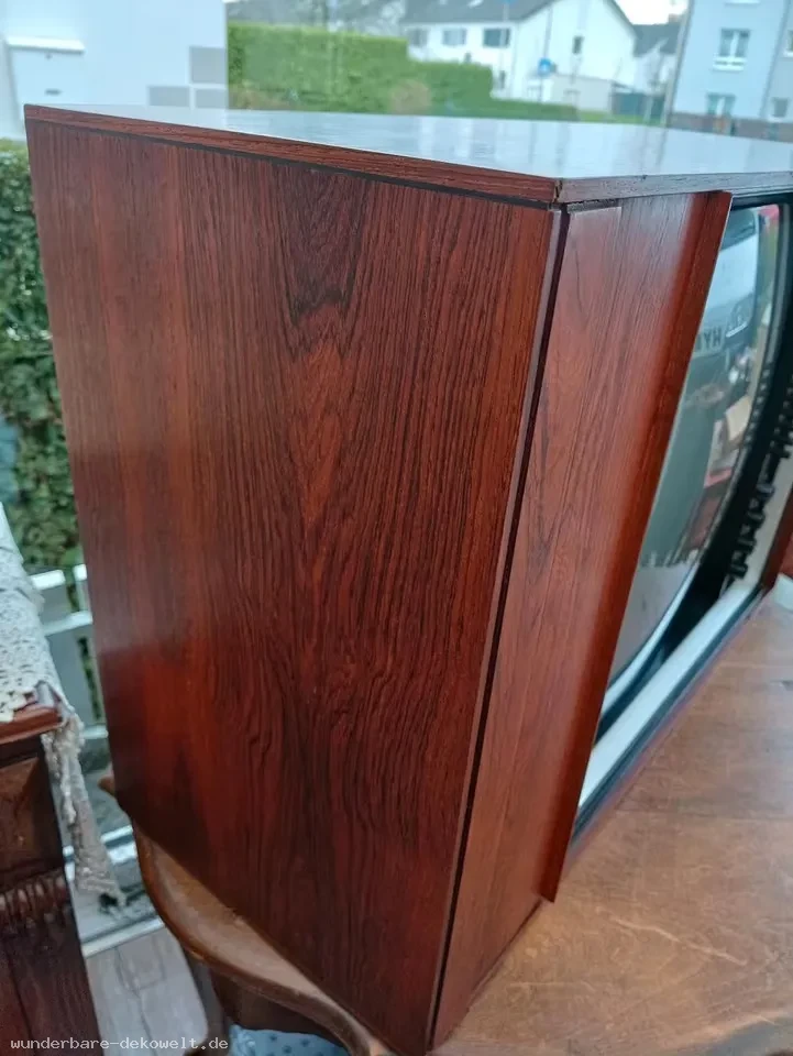 Angeboten wird ein „Bang & Olufsen“ Fernseher der 70.er Jahre in stilvollem, dekorativem Palisander Schiebetüren Lamellenschrank (ohne Fuß!).