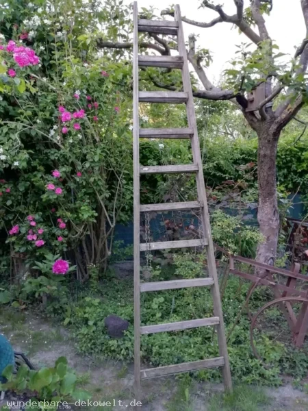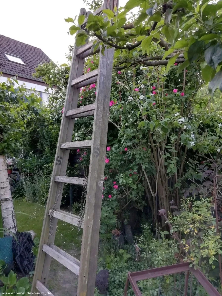 Alte große Vintage Klappleiter aktuell auch als Deko-Kletterhilfe am Haus oder als Gartendesign.