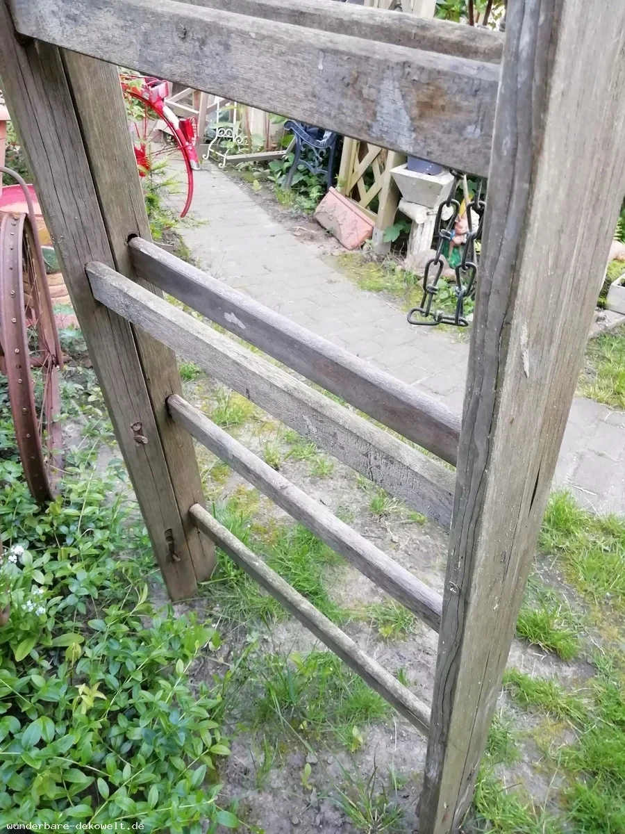 Alte große Klappleiter aktuell auch als Kletterhilfe am Haus. Zum Behängen von Pflanztöpfen oder als Kletterhilfe für Pflanzen.  Zwecks Stabilität wurden die Leiterteile zusammen geschraubt, Sprossen sind nicht mehr alle trittfest, unterste zwei fehlen, dekorative Ketten, Metallbeschläge und Patina.