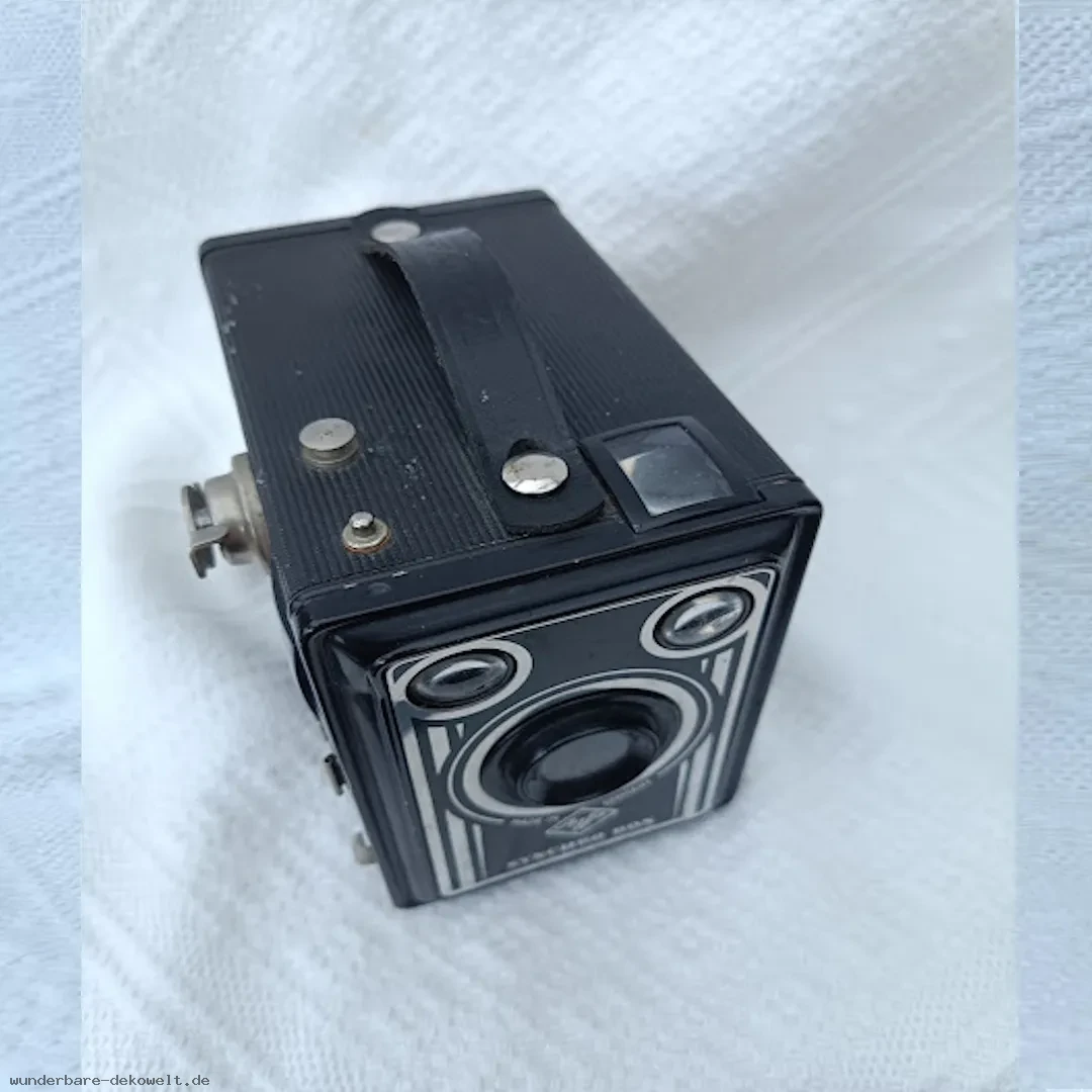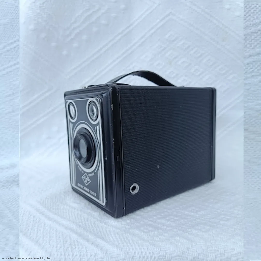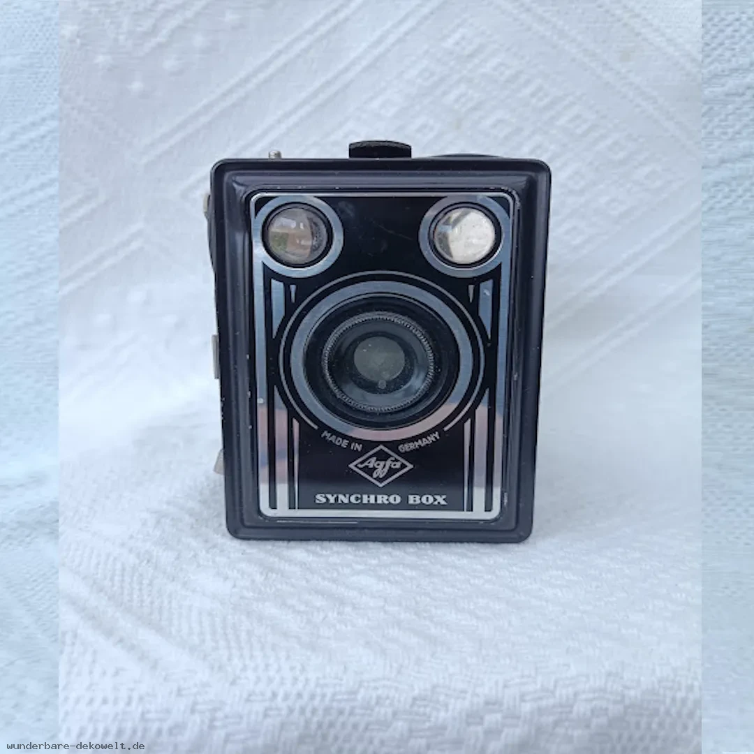 Klassische Rollfilm-Boxkamera von Agfa aus der Nachkriegszeit. Die Synchro Box steht für einfache, robuste Fototechnik ohne komplizierte Einstellungen – gebaut für unkompliziertes Fotografieren.