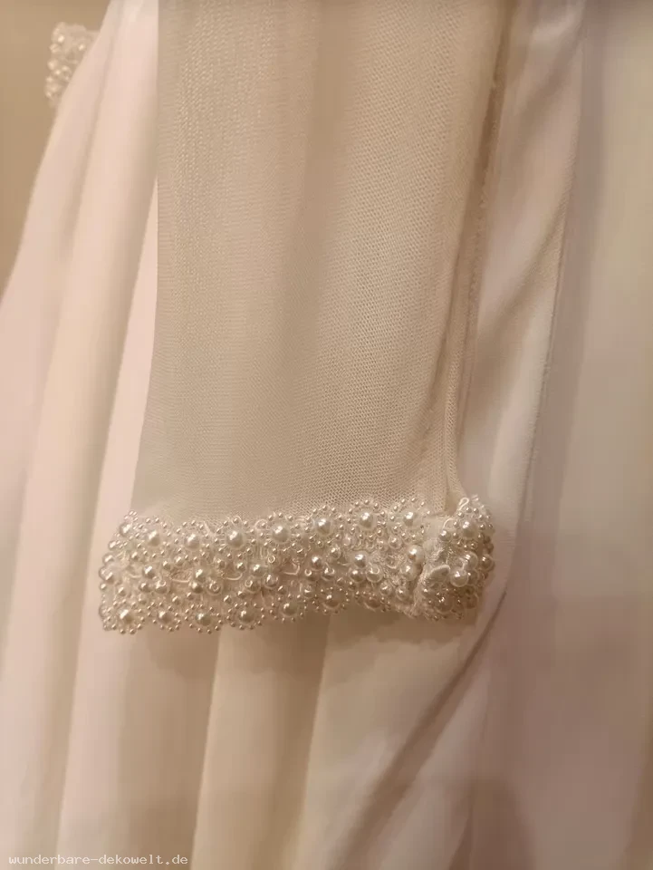 Der gelbliche Schatten auf dem Perlenaufsatz vorne ist nur Schatten am Foto, das Kleid ist reinweiß.