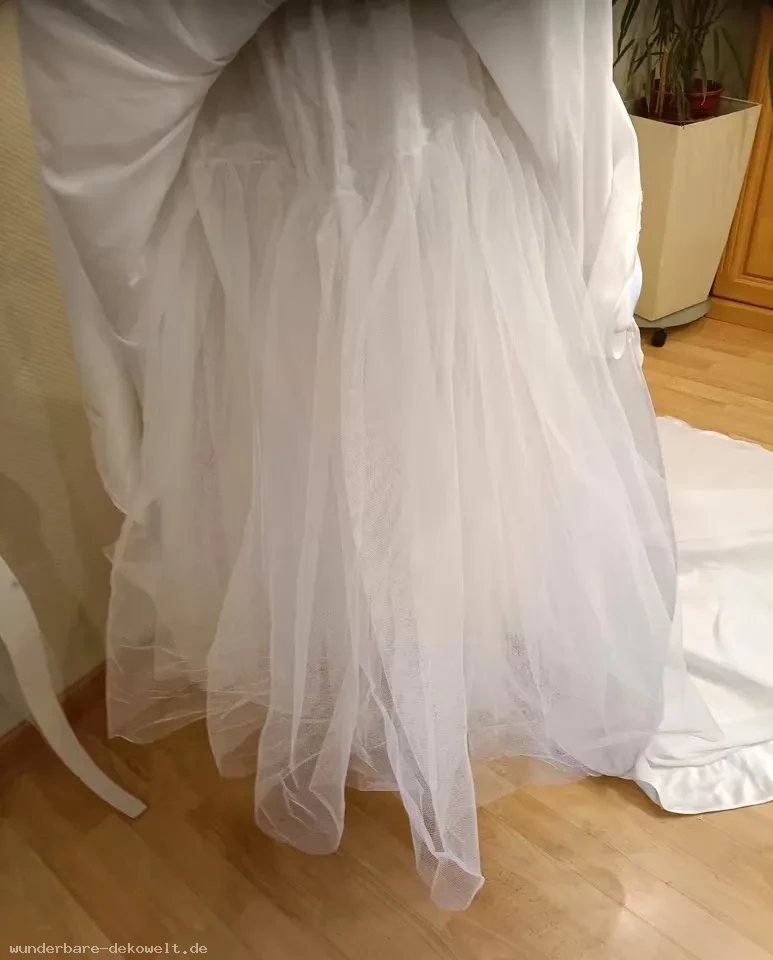 Am Rücken zieren Perlenknöpfe und Spitze. Der Rock hat 4 Stofflagen, zweimal davon mit Tüll, was den Rock elegant ausladend macht. Eine lange Schleppe aus zwei Stoffbahnen rundet das Ensemble ab und kann mit einer Schleife an der Hand getragen werden.