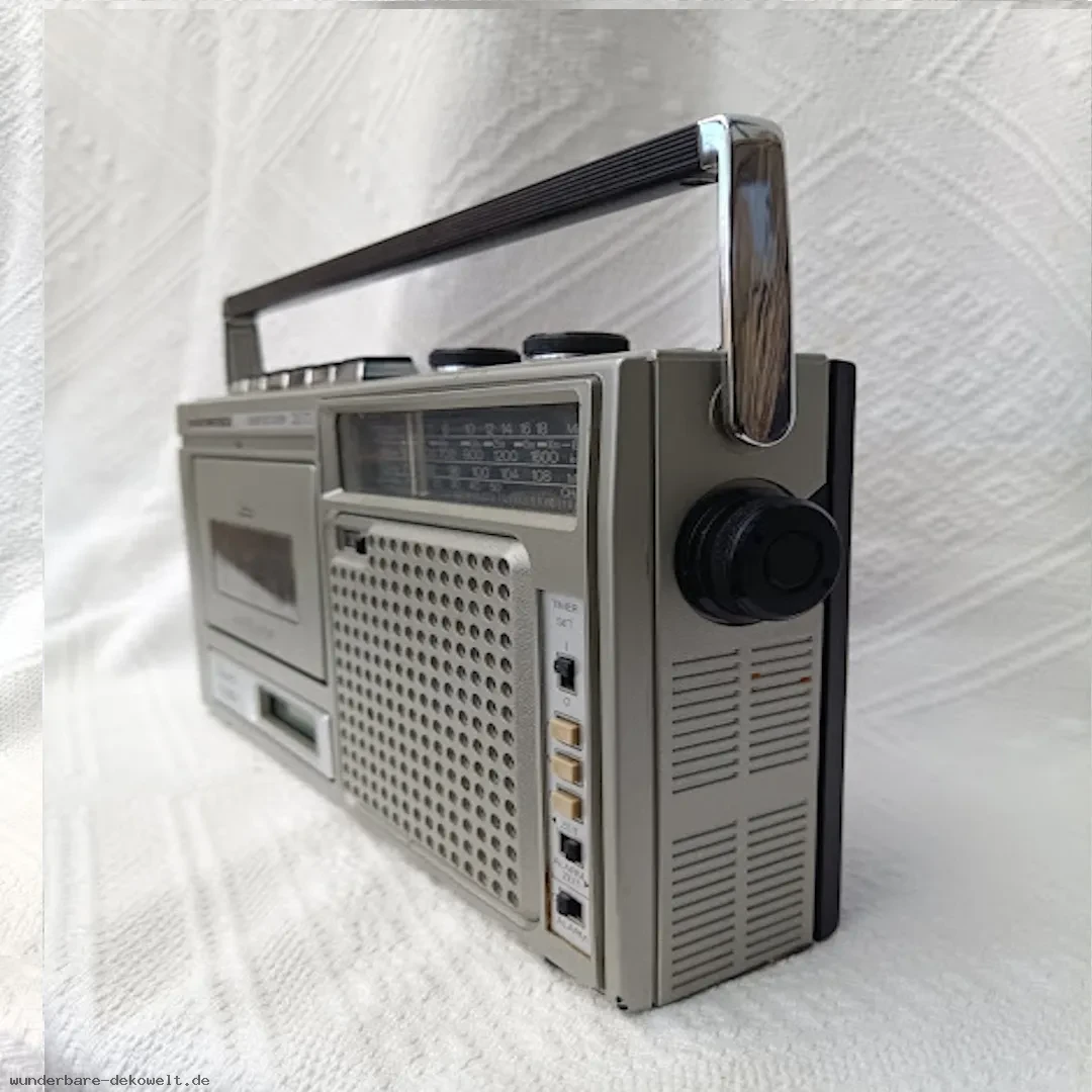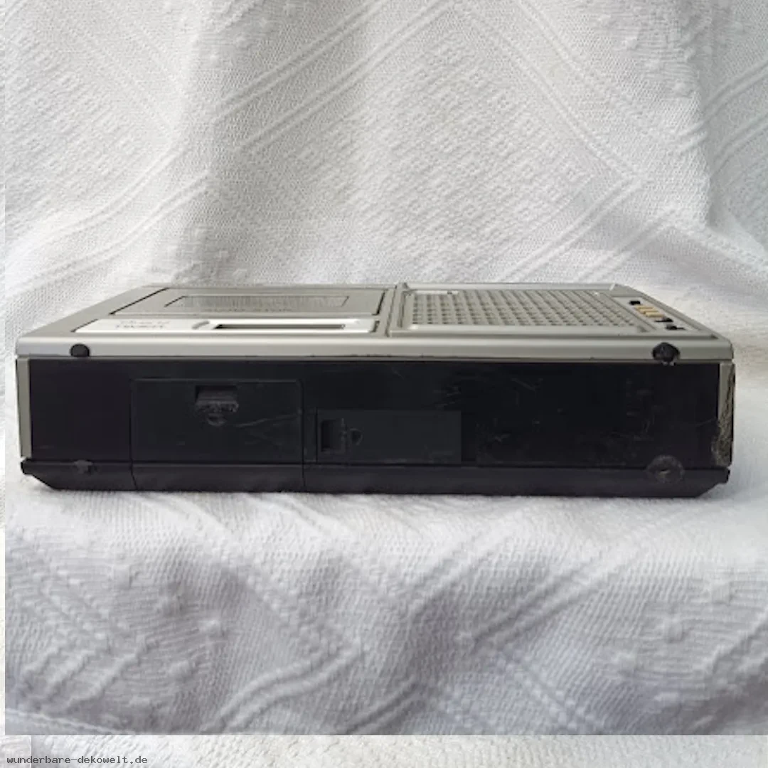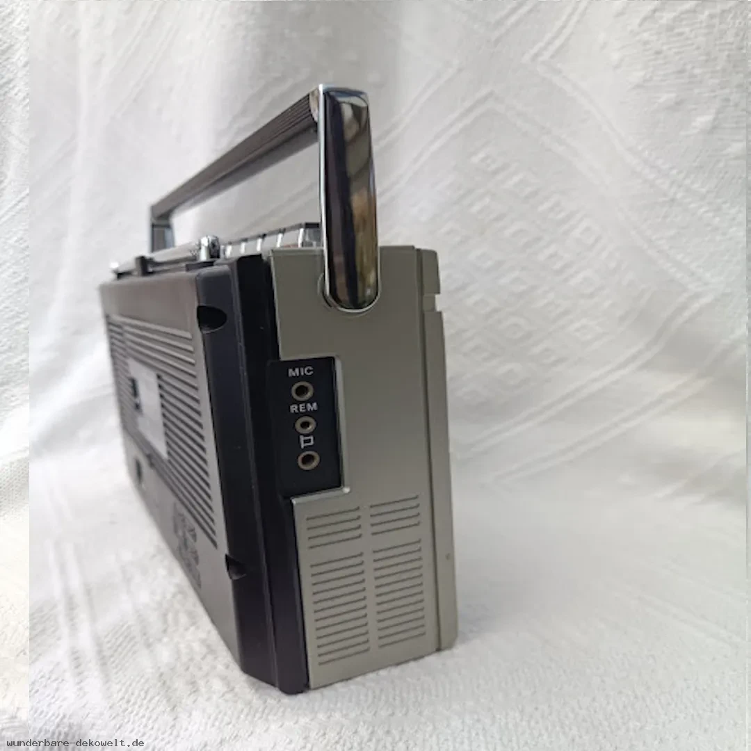 Kompaktes Transistorradio aus der Zeit der 1970er Jahre. Typisches Design dieser Ära mit klarer Frontgestaltung, analoger Senderskala und seitlichen Bedienelementen. Solide verarbeitetes Kunststoffgehäuse mit Tragegriff.