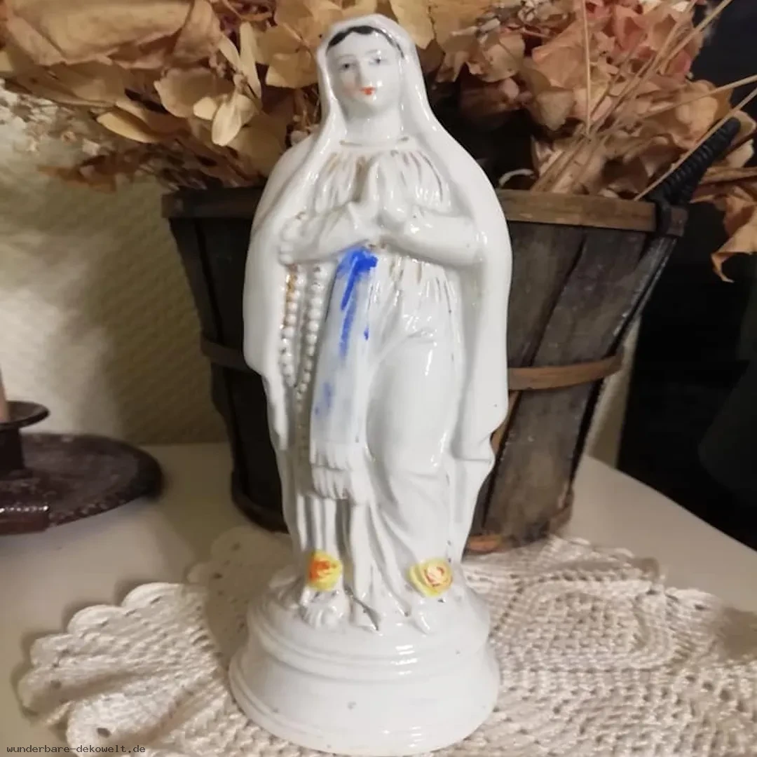 Hergestellt wurde die Figur in einer Porzellanfabrik der 1960er Jahre, wie es an der Glasur und der Materialqualität erkennbar ist. Die Herstellungsweise ist klassisch: hochwertiges, glasiertes Porzellan, sorgfältig modelliert und teilweise bemalt. Die Teilcolorierung wurde behutsam aufgetragen, sodass die zarten Konturen der Madonna erhalten bleiben und ein harmonisches Gesamtbild entsteht.