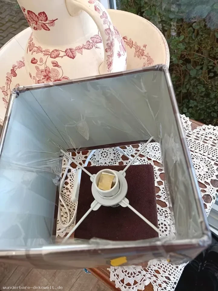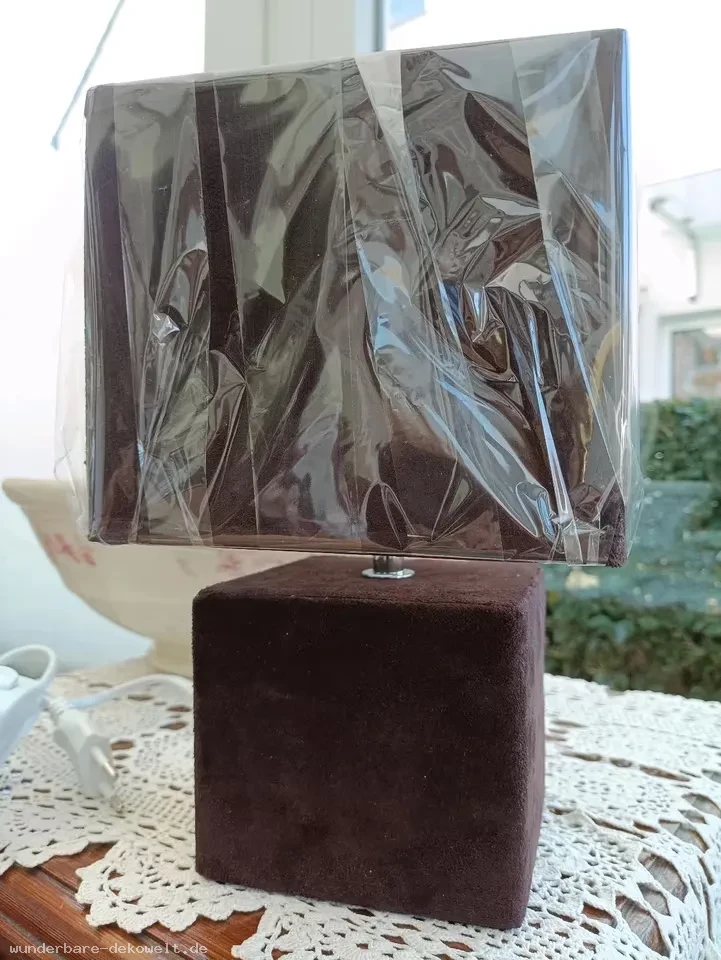 Schirm original verpackt. Brauner Schirm (einfarbig, die Streifen sind von der Verpackung) und Fuß in Velours gearbeitet, Klickschalter, praktisches langes Kabel (ca 1,30m)