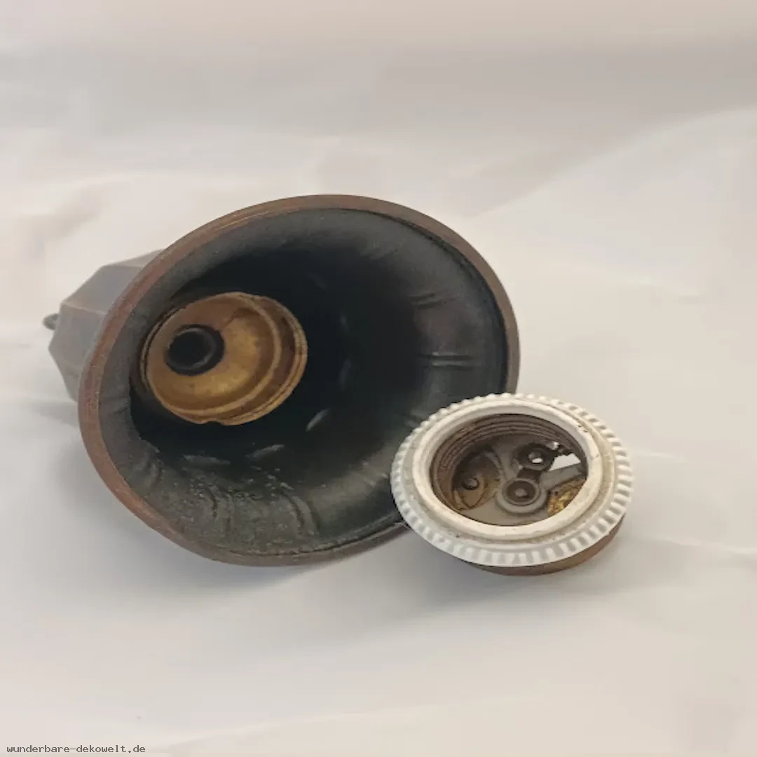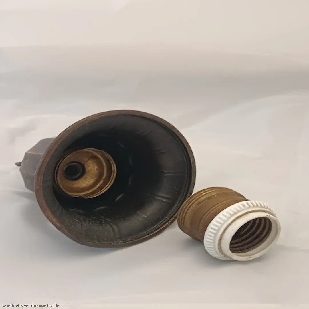 Vintage-Lampe aus Kupfer mit Keramikfassung und neu montiertem Jute-Textilkabel. Die Oberfläche wurde so aufgearbeitet, dass die Kupferpatina und der ursprünglichen Charakter erhalten blieb – leichte Unregelmäßigkeiten sind bewusst erhalten und unterstreichen den authentischen Vintage-Stil.