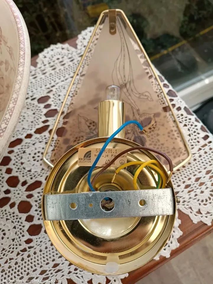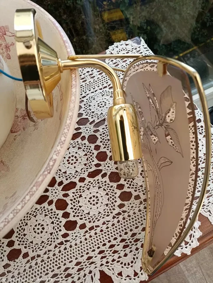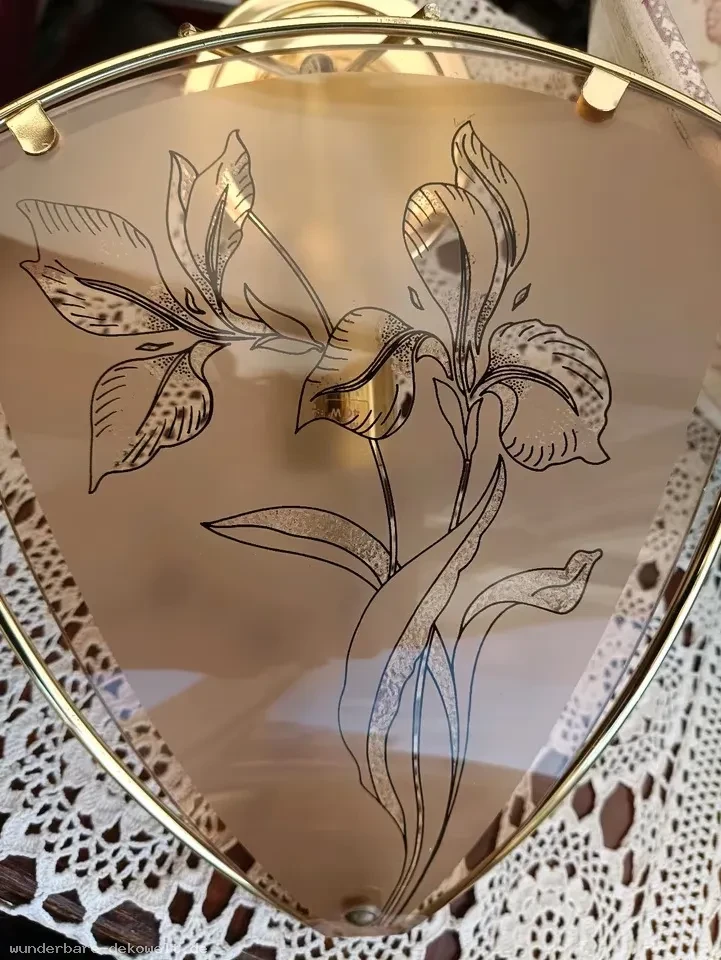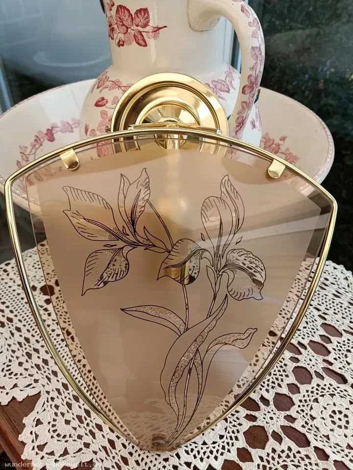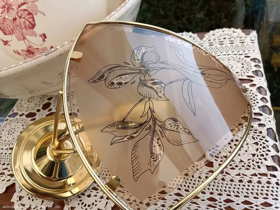 Vintage Wandleuchte „Kramer“ mit floralem Design auf dem Lampenglas und goldener Metallfassung .